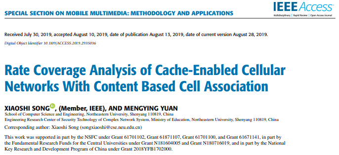 8月13日,工程中心宋晓诗老师在IEEE ACCESS(中科院JCR二区,IF3.557)发表题为“Rate Coverage Analysis of Cache-Enabled Cellular Networks With Content Based Cell Association”的文章。
