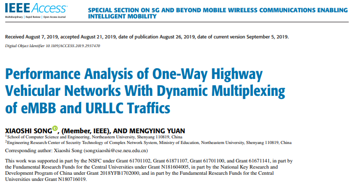 826日,工程中心宋晓诗老师在IEEE ACCESS(中科院JCR二区,IF3.557)发表题为“Performance Analysis of One-Way Highway Vehicular Networks With Dynamic Multiplexing of eMBB and URLLC Traffics”的文章。