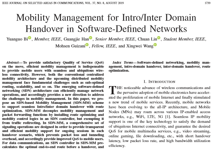 IEEE Journal on Selected Areas in Communications是中科院SCI一区期刊,是通讯领域的国际杂志之一,毕远国教授的论文[Mobility Management for Intro/Inter Domain Handover in Software Defined Networks]被该期刊录用。
