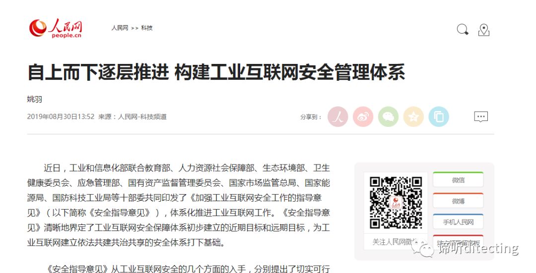 8月30日,人民网发表了复杂网络系统安全保障技术教育部工程研究中心主任姚羽教授关于《加强工业互联网安全工作的指导意见》(以下简称《安全指导意见》)的解读文章——《自上而下逐层推进 构建工业互联网安全管理体系》。文章针对《安全指导意见》中提出的主要任务进行深入的分析与解读,提出“构建工业互联网安全管理体系需要自上而下逐层推进”等重要观点。